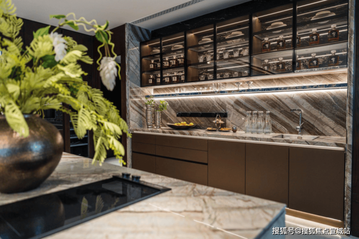 西厨吧台更是匹配了符合空间调性的东方木纹与龙飞凤舞石材,独特的纹理和质感提升了厨房品质与艺术性。