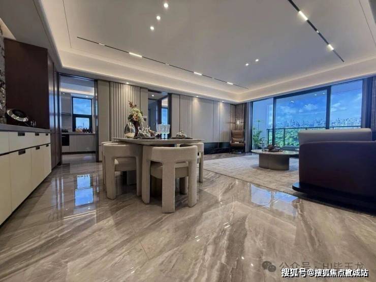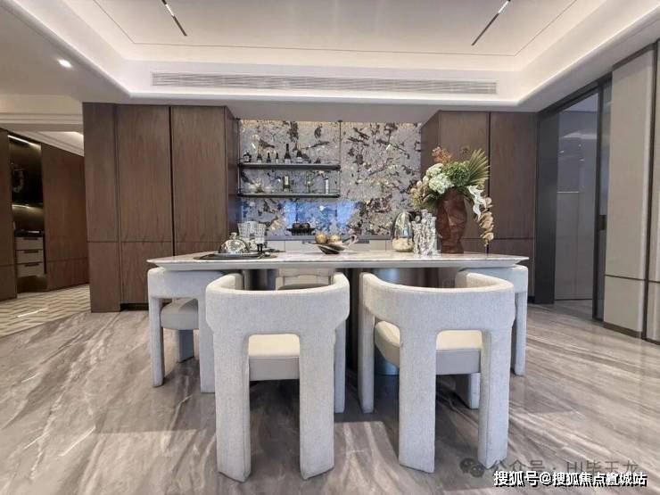 玄关间空非常宽敞,配置有定玄制关柜,出更入具仪式感。客厅餐区域,餐厅、电视背墙景面都是材石的,地面是瓷砖铺就,配置有定制餐边柜、弗兰卡水的槽和头龙等。