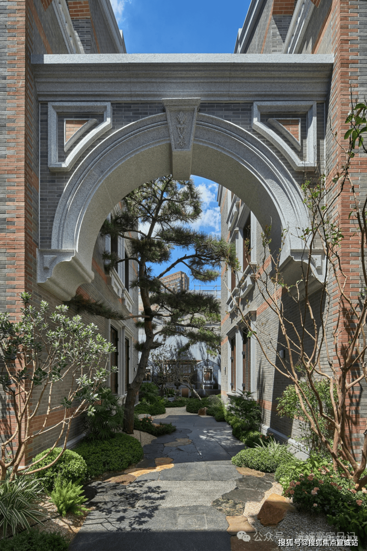 地面延续酒店式落客区海棠纹拼花镶钻,铁打纹工艺,其间还有老石板,青石板,中国黑老石皮,柏坡黄的石皮等原石原面铺装,老石皮从大料里取出,数量少而贵,由此也可看出保利·永兴里在别墅打造上是真舍得,也是真高级。