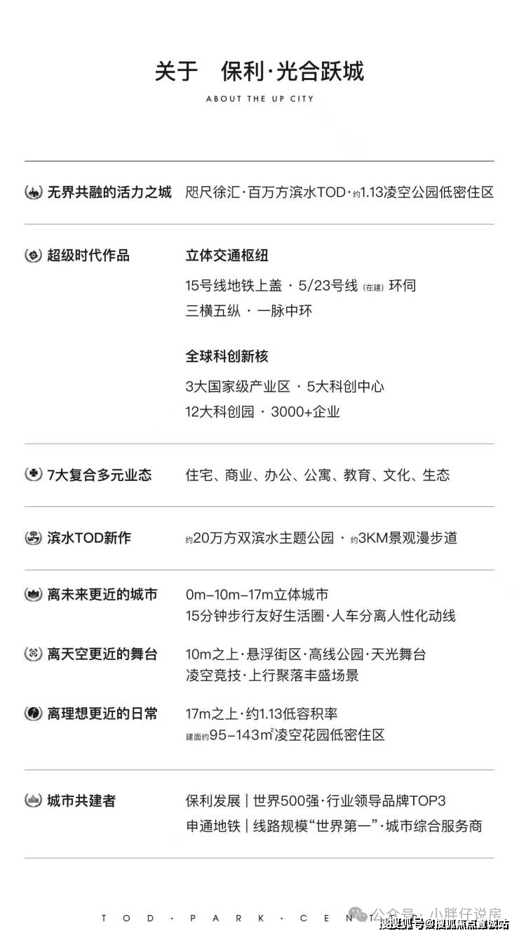 保利·光合系TOD售楼处电话:400-902-3966作品,以TOD+PARK+CENTRE为造城理念,“站城一体+滨水公园+全系业态”的TOD5.0新物种,打造集住宅、商业、办公、公寓、文化、教育、生态七大多元业态于一体的百万方滨水TOD大城,筑就面向未来、面向国际的消费新主场、创新企业链、全系配套生活圈等活力新场域;光合系下三部生命力作品「跃城」、「上城」、「臻园」,共筑一座无界共融的未来理想单元,启幕上海崭新想象。