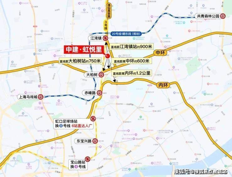 轨交配套:中建·虹悦里直线距离3号线大柏树站约750米,直线距离江湾镇站均约900米,步行可及。3号线也是多年才出一个轨交房。畅联中山公园/延安西路;三重高架:临近中环高架/逸仙高架及大柏树立交,迅捷衔接五角场/大宁等地;干道交通:周边汇聚逸仙路/汶水路/中山北路等城市主干道,便捷抵达全城。