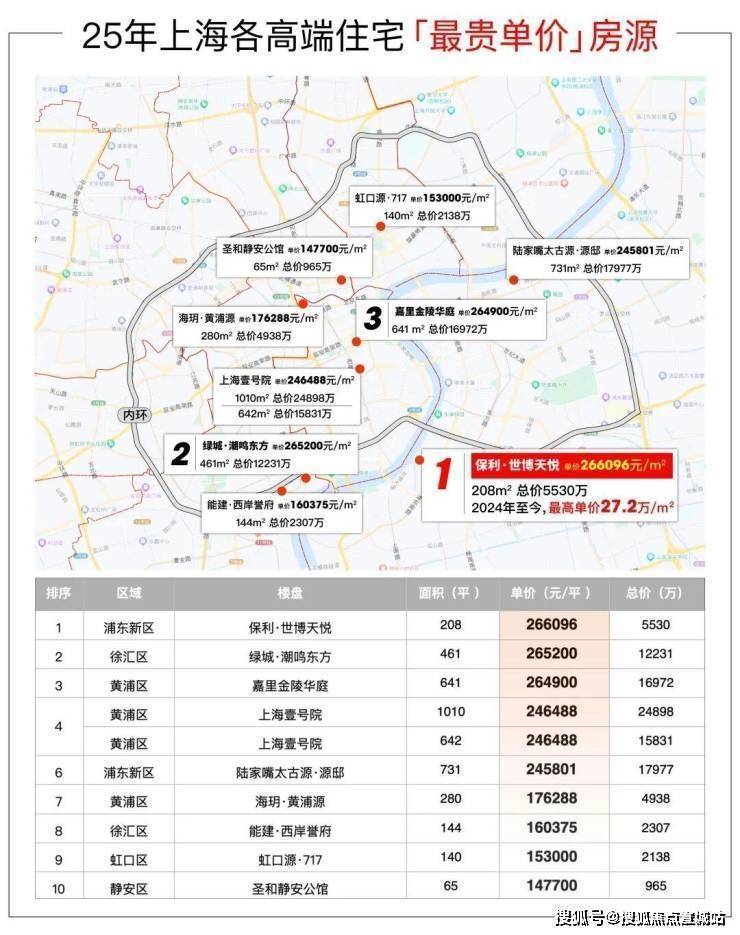 一线滨江世博板块的保利世博天悦(26.6万/m²)拔得头筹,成为2025年上海豪宅市场的新晋王!