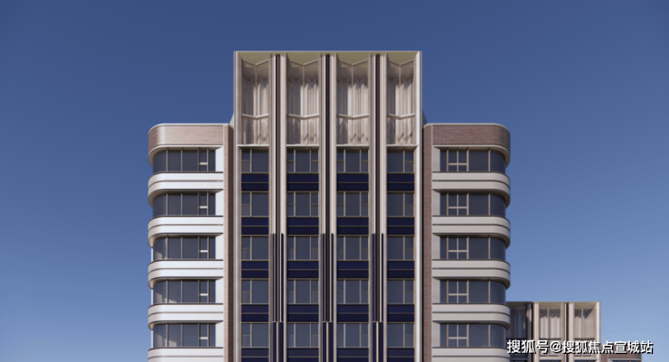 采用大量弧线工艺,包括转角玻璃阳台、弧形铝板、墙面线条和大门线条等,致敬了邬达克装饰艺术派的设计美学。