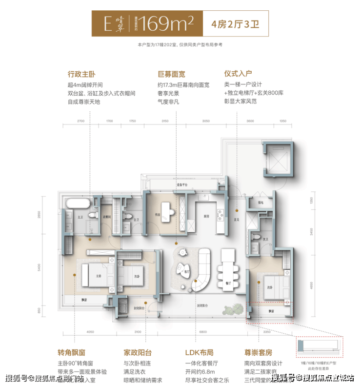 它是一个缩小版的169㎡,同样是四开间朝南、独立电梯厅,总价降至500万级。