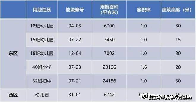东区和西区最大的不同在于教育和公建设施配套,东区人口更密集,有5幅教育用地,从幼儿园至初中;而西区仅有1幅教育用地,作为幼儿园。