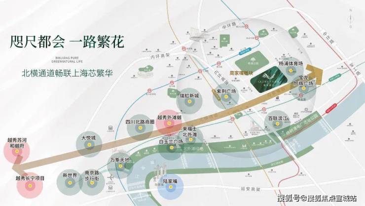 北横通道:继延安路高架后,上海第二条东西向财富积聚中轴线,平行于江河流向,串联虹桥-长风-苏河湾-北外滩-杨浦滨江等上海都心位置