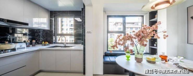 让餐厅成为家庭聚会的中心。这种开放式的设计不仅增加了空间的流动性,而且促进了家庭成员之间的互动。黑色的飘窗柜与白墙的经典色搭配,以及侧柜发光亚克力隔板,进一步加强了餐厅空间的设计感和氛围感。