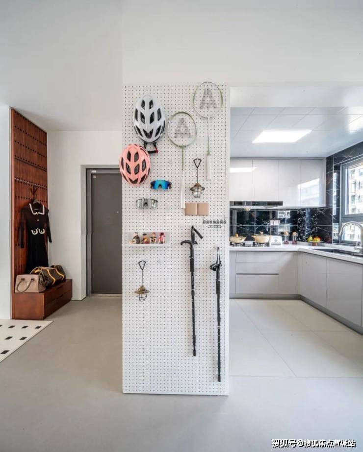 厨房外墙不锈钢洞洞板的设计提供了一个灵活的收纳解决方案。这种材料不仅耐用,而且易于清洁,不仅拓展了收纳空间,还为客餐厅平添了一份装饰。