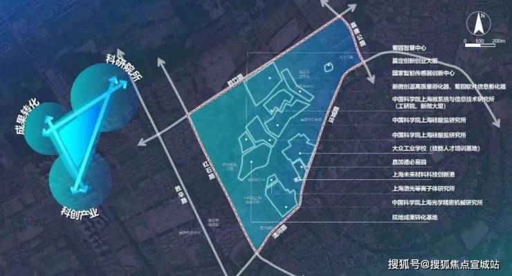 科技城自主创新产业承载区(嘉定工业区、菊园新区等区域)发挥国家级科研院所集聚和新型工业化产业示范优势,打造嘉定科创高地区,创新区内聚集约 2000家企业,10个国家级科研所(嘉定区11个),科研人员2万多人;以及六个国家级的园区,联影医疗、百度、京东、沃尔沃亚 太总部以及美国杜邦、德国宝马等跨国集团纷纷入驻工业区。