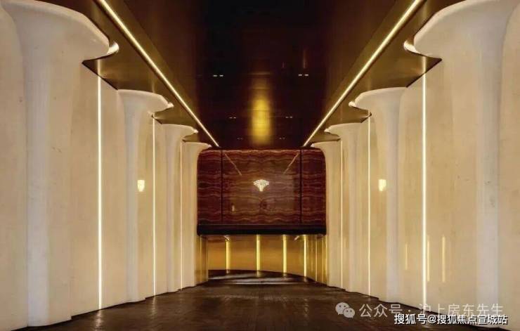 6、社区含“奢材”量很高。门庭延街的外立面,以精工定制弧形米色石材为主调,镶嵌典藏级老虎玉大理石,点缀古铜色现代海派艺术感灯器,整体呈现出百年海派的贵雅气质。