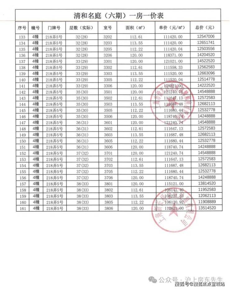 一房一价表如下