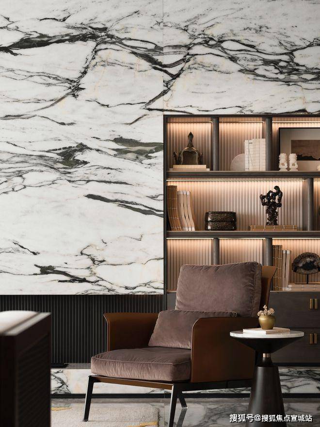 建发缦云售楼处电话:400-8862-334步入玄关处,以一整面森林绿大理石背景墙做视觉隔断,搭配两侧艺术造型的皮革硬包,观感上既没有大面木质隔断的厚重,又不失新中式应有的华丽。当然,木材在新中式产品打造过程中依旧不可或缺,因此缦云仍在玄关处打造了大量木饰面,并采用海棠花腰线设计来提升饰面美感。