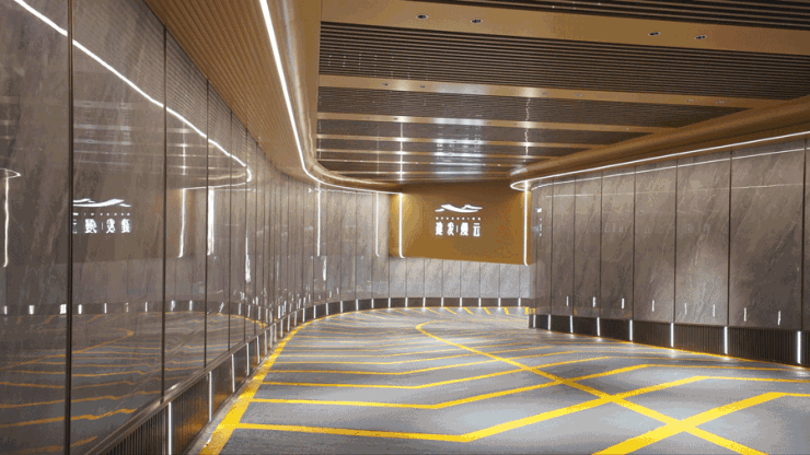 结束一天的疲惫,驱车归家的路上,车库是品质生活的延展。目之所及坡道两侧,三块精准对纹岩板如泼墨山水,铝方通透光灯膜交织流动光影。