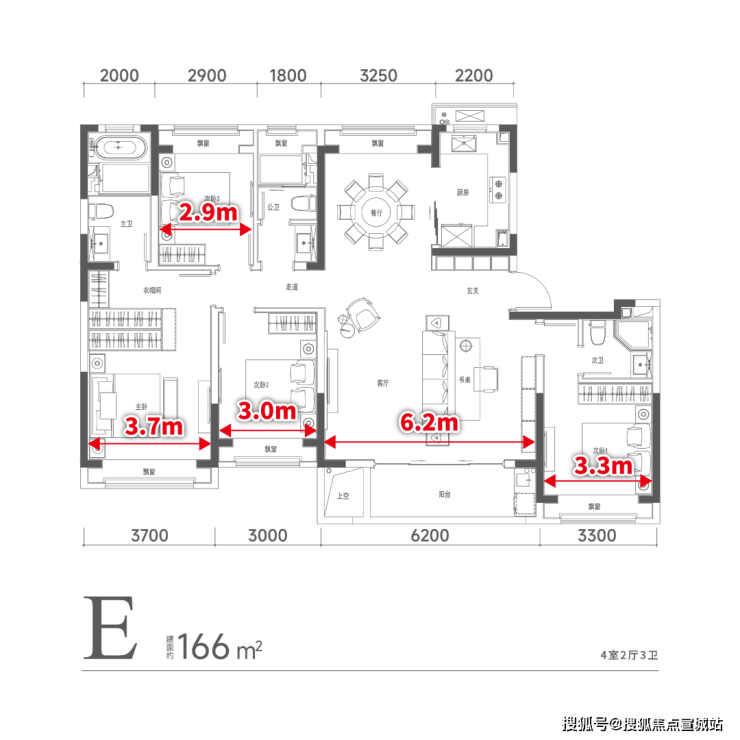 建面约166㎡户型图和尺寸如下: