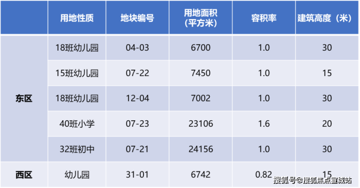 东区和西区最大的不同在于教育和公建设施配套,东区人口更密集,有5幅教育用地,从幼儿园至初中;而西区仅有1幅教育用地,作为幼儿园。