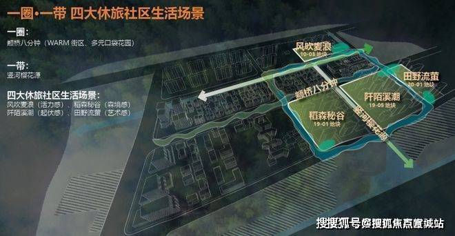 约15万方天然水域重构滨水生活想象沿天然水系河道规划滨河绿廊、活力水岸、休闲水岸、风景河岸等。