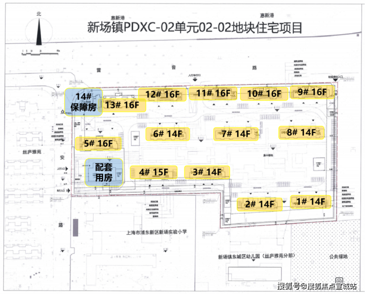 根据项目设计方案显示,拟建6栋14F商品房、1栋15F商品房、6栋16F商品房、1栋16F保障房、1栋2F社区配套、1个KT站、5个PT站地上建筑、1个垃圾房、1座地下车库。