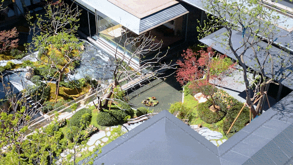 再往里走就是近460㎡的下沉式庭院,精选太行山金景石堆叠成小山丘,引进溪水汇聚成池塘,并移栽岭南珍贵的古桩铁冬青和中华原生乌桕树,形成一幅立体山水画卷。