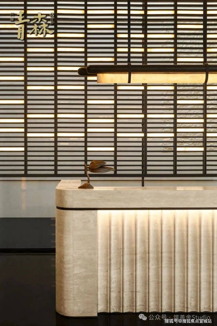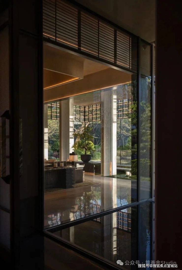 建筑外立面采用全铝板环绕四周,大尺度玻璃点缀其间,构筑出对称中蕴含韵律变化的立面,呈现出独具一格的森系设计。在光影的交织流转中,为空间注入优雅的生命力,与森系园林完美融合,相映成趣。