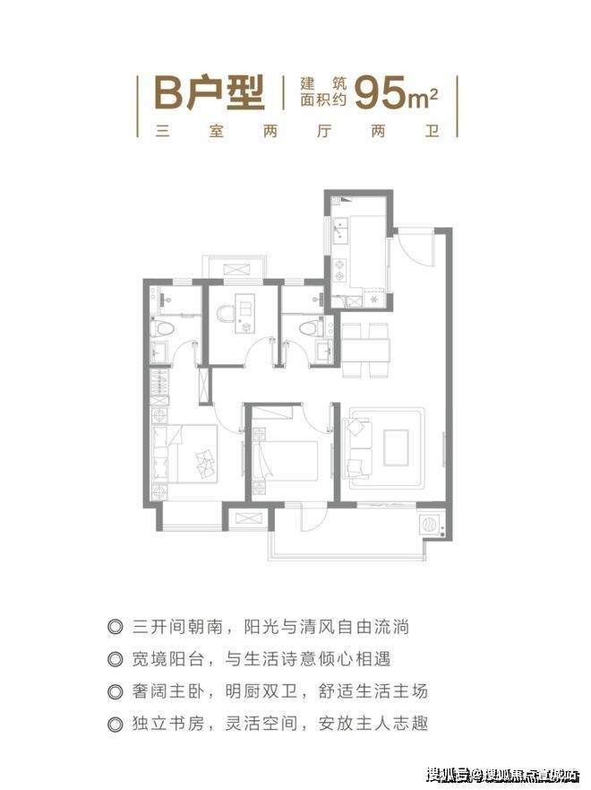 建面约95㎡的3房2厅2卫户型,这个户型的实用性太高了。能保证业主从二人世界到二胎家庭的全生命周期需求。