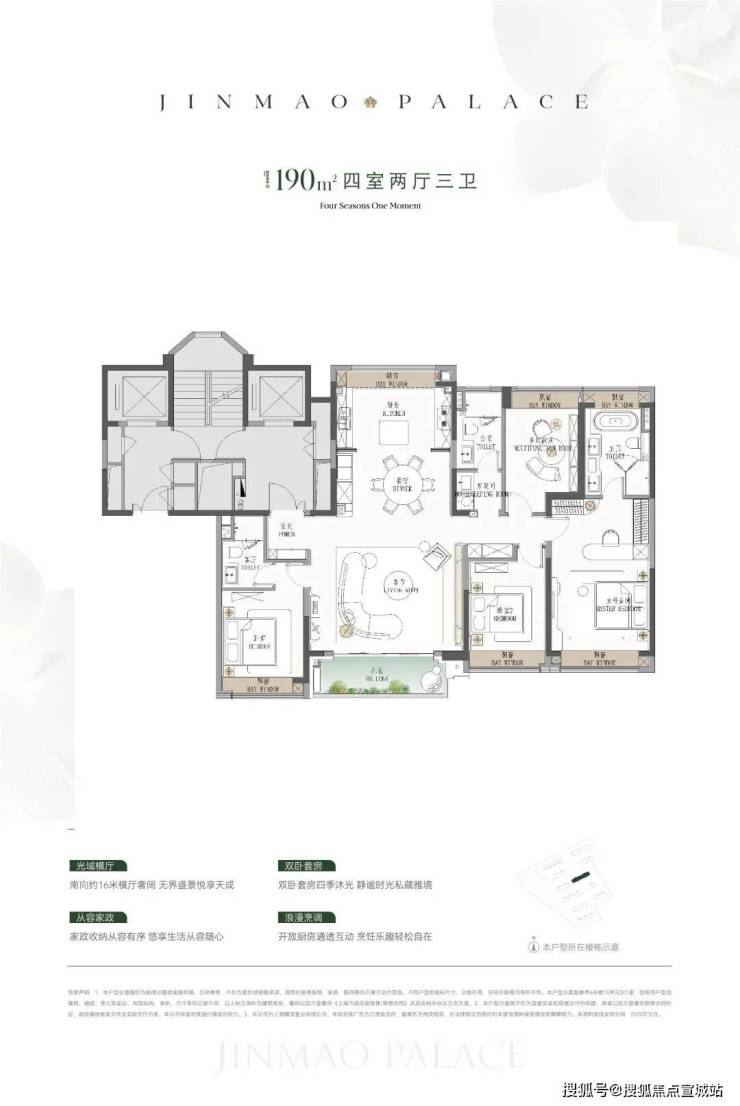 ● 建面约190㎡4房:楼王位置的顶奢大平层,同价位段在杨浦只能买到约120㎡3房!