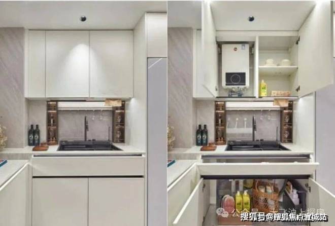 譬如说部分柜体更安全的圆角处理、高柜顶部一窥到底的镜面反光膜、大大提高空间利用的薄抽,不用弯腰一踢即开的踢脚抽设计,便利性大大增加;