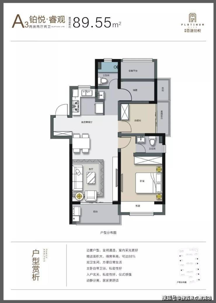 主力户型:建面约 80-89㎡的两室两厅一卫,全明格局;建面约 94-110㎡的三室两厅两卫,双开间阳台。
