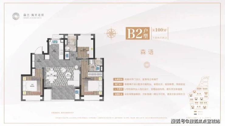 1、建面约100㎡三房两厅两卫,市场主流户型。客餐横厅设计配多功能阳台,优势在于更大采光面和更好通风效果,把过道纳入到客厅和餐厅的空间中来,使整体空间得到更好的利用。森兰海天名筑售楼处营销中心:400-8618-004森兰海天名筑售楼处电话/地址☎:400-861-8004(开发商热线)