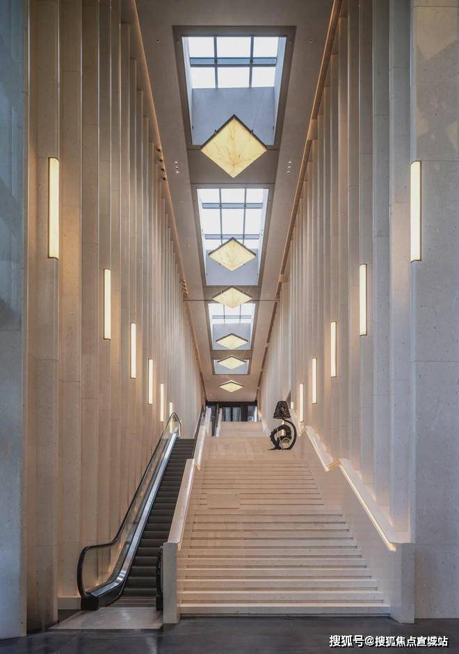 从海派入户旋转门推门而入,看到的是约13-15米的挑高大堂.三层艺术阶梯的进阶之感,层层递进,犹如登山之“径”,气派恢宏.