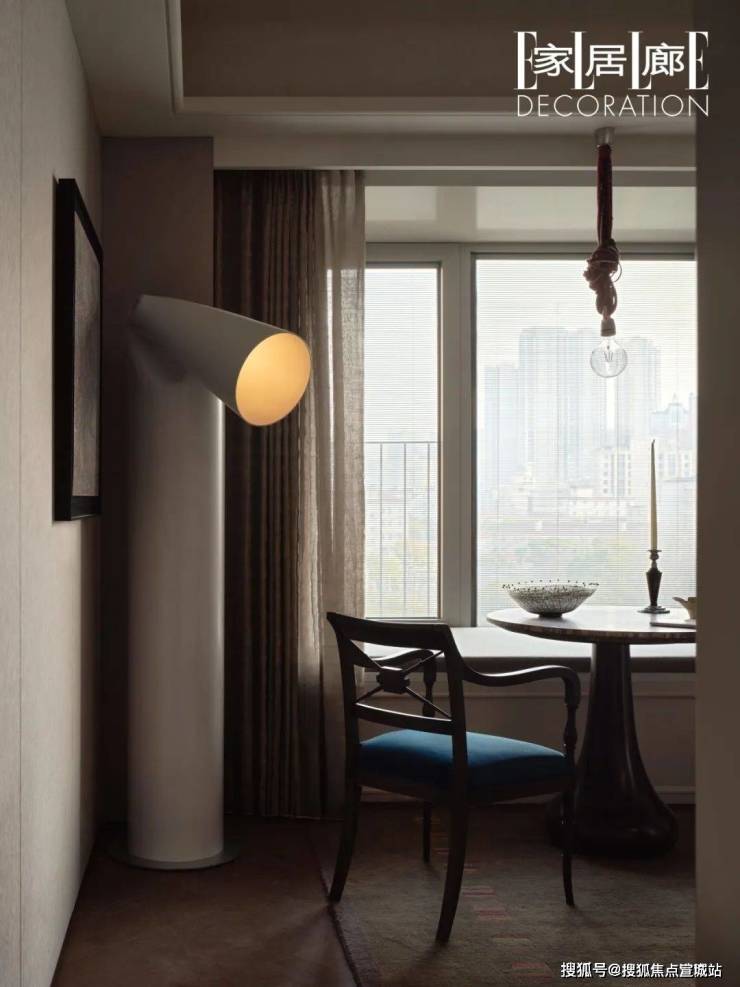 连廊视线直达的一侧是兼具了书房与化妆间功能的休闲室,这里成为联通卧室的另一个纽道。艺术化的软装配饰将视觉定格,让来者不自觉停下脚步细看。空间中单品的存在有依可据,绳结式样的吊灯是艺术家用旅行中带回来的纱线材质重新定制的产品,生活的样貌由各种经历构成,那么物件的来源自然也应该属于生活一部分。