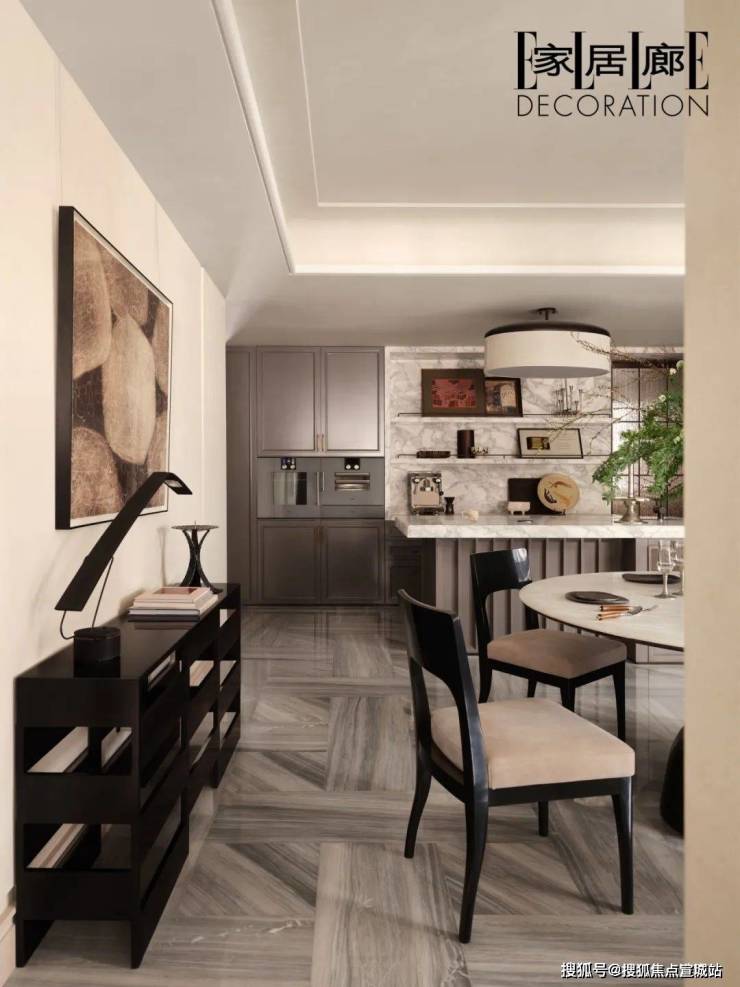 入户的一刻,空间的视觉体验从一个以小型圆桌为焦点的副厅开始。设计团队有意介入黄金十字轴的布局方法,对空间的界限进行模糊和延展处理,最大程度地释放尺度,强调仪式感的同时,制造和引导动线的洄游,让空间相互渗透,形成多义的生活形态。