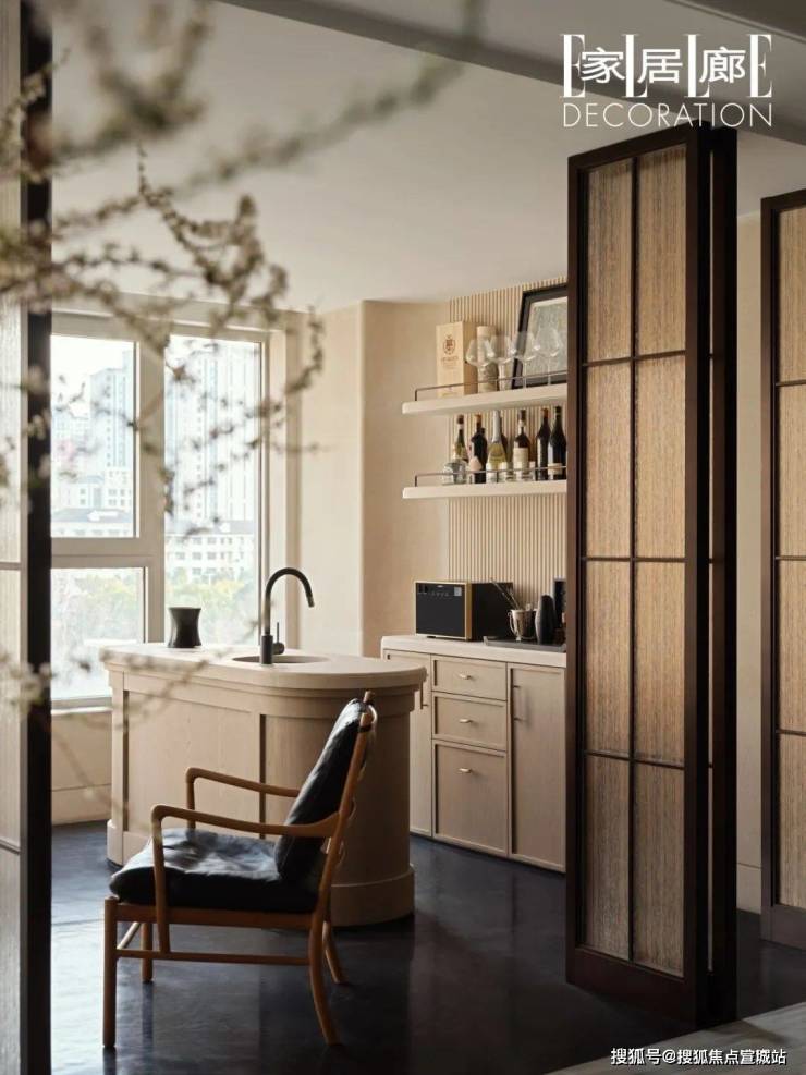 室内阳台又被称作“花园酒吧”,折叠移门如屏风,半遮半掩,延续着住宅暧昧不明的特质,将客厅的视觉深度拉长。当入夜仅留一盏小灯,空间可借室外星星点点的灯火为伴,让城市的脉动成为居住氛围的一部分,是另一种讲述情感依托的方式。
