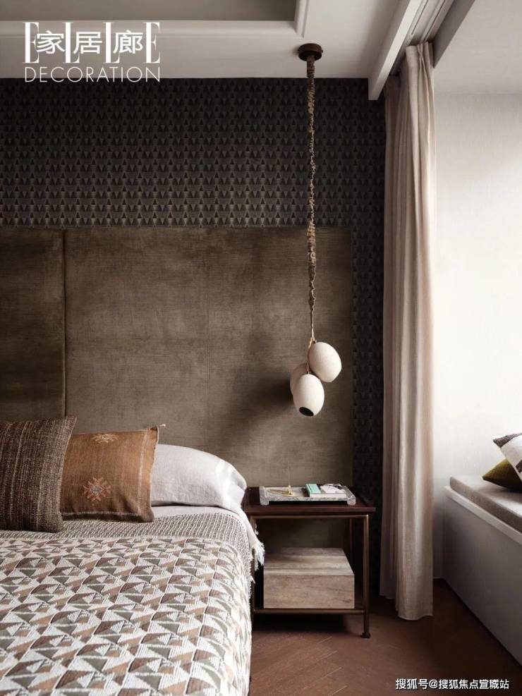 因此,设计摒弃花哨的视觉语言,回归到“感受”本身。“作为最接贴近自己的空间,卧室里你最在意的是什么?”,这个答案落在了“环保”与“亲肤”上。设计师选择羊毛、棉麻等作为卧室空间的体感材料。而不管是从欧洲特别定制的毛毯到床头软包面料都经历了一系列苛刻的筛选,以达到人们心目中理想的使用体验。