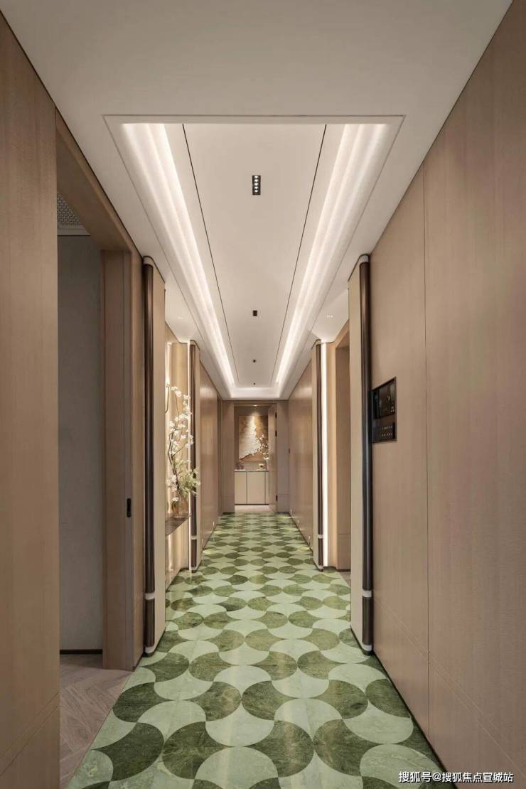 主卧的锤纹门把手、地板花瓣拼、镂花的空调出风口每一个都是世界级的工艺。同样,精装的用材也很考究,从电梯厅到室内各种奢材在这里齐聚,瑞士翡翠、白雪公主、蒂芙尼绿、巴黎金等奢石,还有仿锤纹夹丝玻璃、仿古锈镜、隐木这些罕见用材增添艺术质感。
