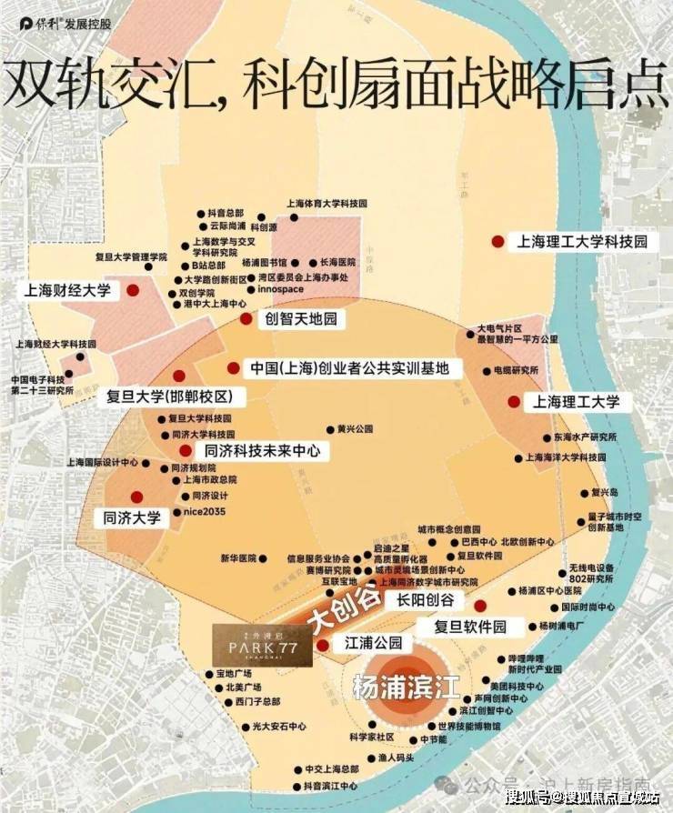 ⭐上海杨浦保利·外滩启PARK77官方售楼处电话:400-877-8334(官网已认证√√)保利·外滩启PARK77售楼中心热线/官方电话为400-8778-334(尊享一对一专属服务√√)最新发布的科创扇面,以5公里的创新半径,在杨浦滨江南段徐徐展开以江浦公园为支点,将“扇面”展开,上海最密集的高校智力资源汇聚于此北望4公里,百年复旦;向西3公里,同济巍然;东南5公里,上海理工;聚合高端人才、链动产城资源,创新杨浦
