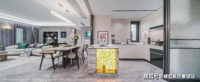 5.整体采用了海派的装修风格,例如更耗时更费钱的带弧度的半圆形吊顶!以及当大部分项目还在用长虹玻璃时, 招商臻境 在厨房的三轨道移门处使用了水波纹玻璃,更具奢华感!这样的细节上次还是在看 3000万级别 的豪宅时才看到!