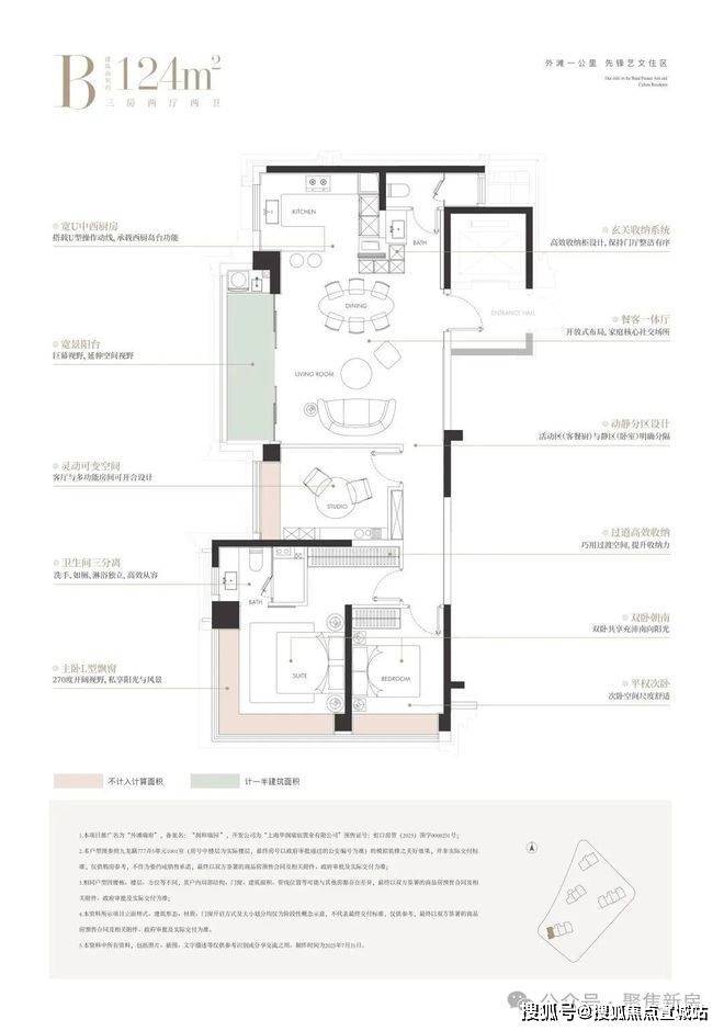 建面约124㎡的边厅“全景舱”户型,是外滩板块极致稀缺的臻品 。它以三房布局满足主流家庭需求,更以无遮挡的视野与巨幕般的边厅落地窗,将城市天际线化为私藏画卷。主卧270°L型飘窗,让阳光与风景成为生活的主角。