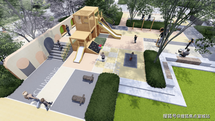 室外会客厅面向草坪,是邻里交流、休憩会客的好地方;健身活动区和儿童活动区一体化布置,看护孩子的同时,也可以健身活动。