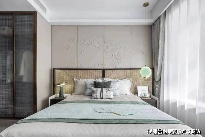 素雅的山石花瓶,还有嶙峋的中式挂画,以及香薰,都赋予了主卧满满的情调感。