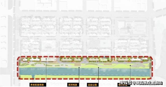 一界面是滨水景观界面(项目红线外),依托南侧的天然水系及滨水公园,打造慢行景观系统,并将滨河栈道、运动公园、骑行等多种功能嵌入,提升舒适度的同时,也为居民提供放松身心的好去处。