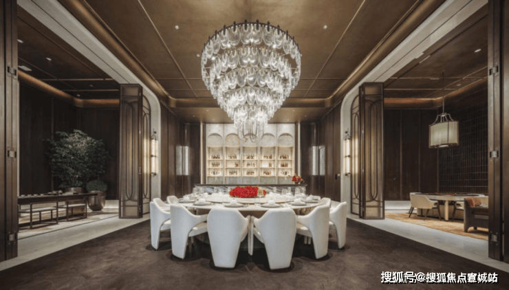 奢享私宴厅,内设巨形艺术水晶吊灯, 还有由整块香格里拉绿奢石一体打磨而成的吧台、白水晶奢石酒架、全景开放式落地窗……优雅格调跃然呈现。女王茶室可对外全部打开,宛若置身绿意和流水中,是闺蜜品茗小憩、私密洽谈的理想私属领地。