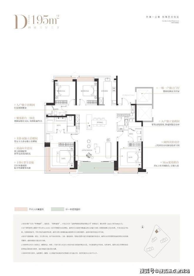 私梯入户、独立玄关,主卧套房带步入式衣帽间与观景飘窗,双卫设计,U 型厨房,动线合理