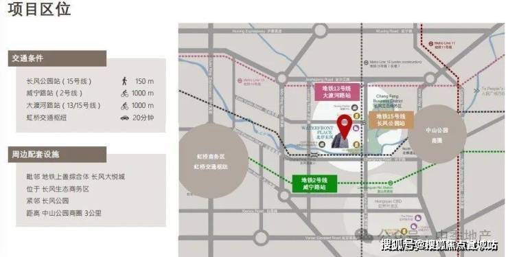 交通配套:项目距离 15 号线长风公园站约 300 米,距离 13 号线大渡河路站约 1KM,距离 2 号线威宁路站约 1.2KM,周边还有多条公交线路。
