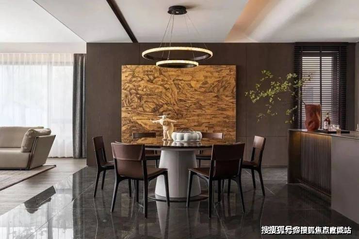 客厅与餐厅的交汇地带通过精心挑选的差异化地板材质,设计师巧妙地构筑起一道无形的软性分隔屏障,餐厅中央设置的开放式岛台,不仅作为烹饪与聚餐的灵活中心,还巧妙地将空间功能进行了转换与融合,同样的作用也在吊灯的设计上显现.墙面上悬挂的巨型壁画,导着居住者的审美情感,让生活空间充满了故事感与个性色彩.