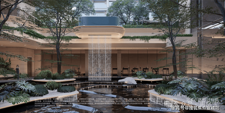 “漂浮的绿洲”,九重层次下沉庭院,区域悬浮泳池+4.3米飞瀑设计,塑造极致度假感受,丰富的视觉奇观。