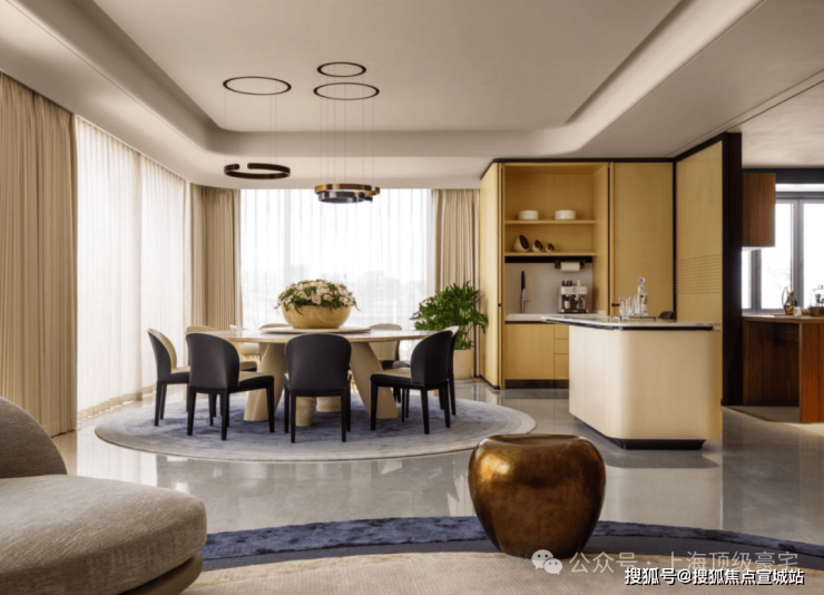 超大面宽横厅,放得下组合沙发、大圆桌、吧台,巨大的尺度感、通透感带来更舒适的空间体验。