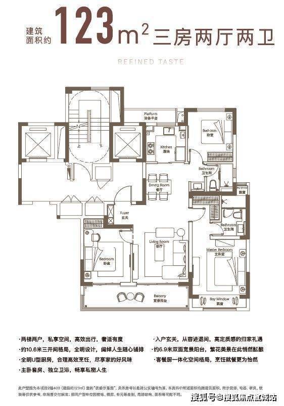 建面约123㎡户型,三开间朝南,约6.9米双面宽景阳台,主卧套房设计,匹配独立卫浴。