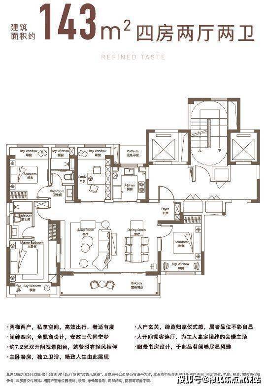 建面约143㎡户型,充分考量了一家三代的居住需求。阔绰的四房空间格局,可把南向卧室打造为老人房,北卧书房可改造成儿童活动空间,开放式的客餐连厅设计,可容纳一整个家庭的用餐。