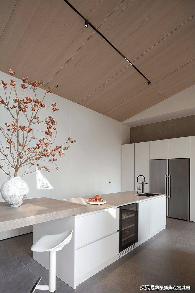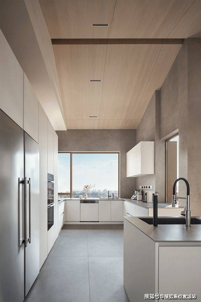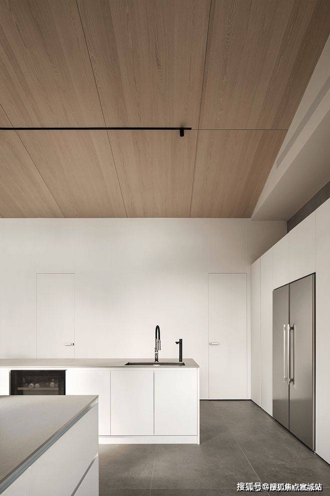 厨房线条洗练,金属的冷静质感与木质的温润柔雅,突显出刚柔兼备的审美立意。