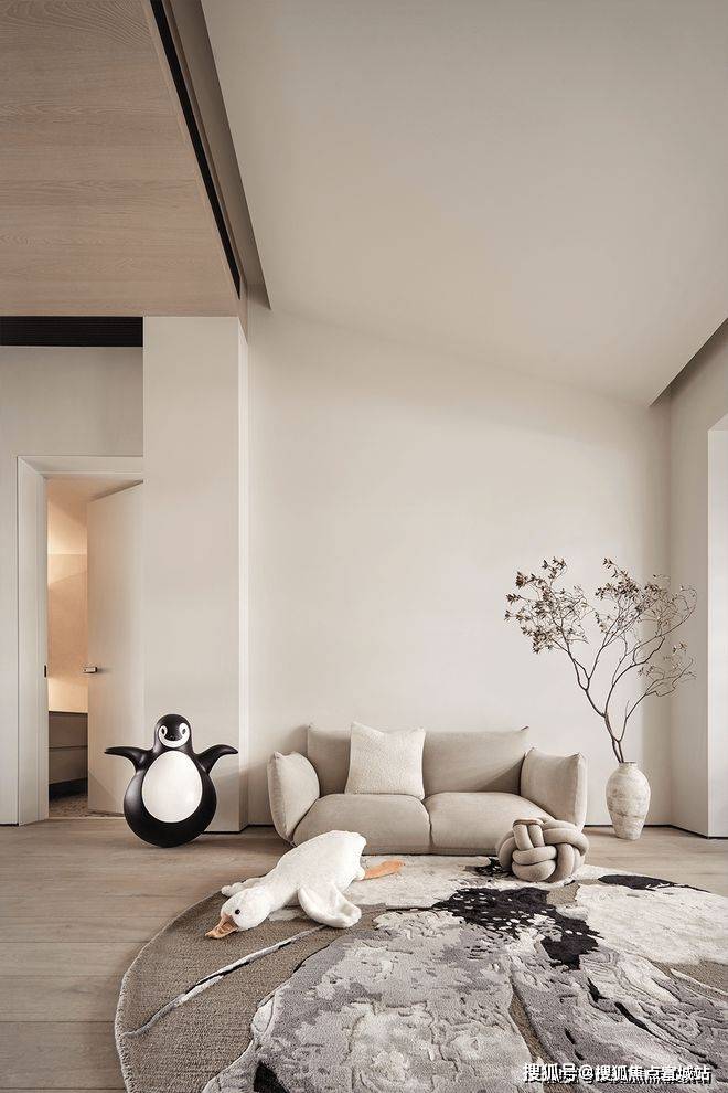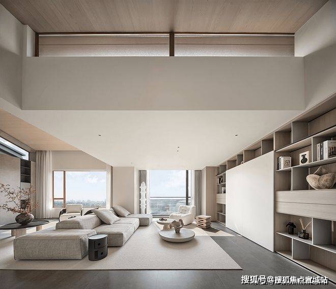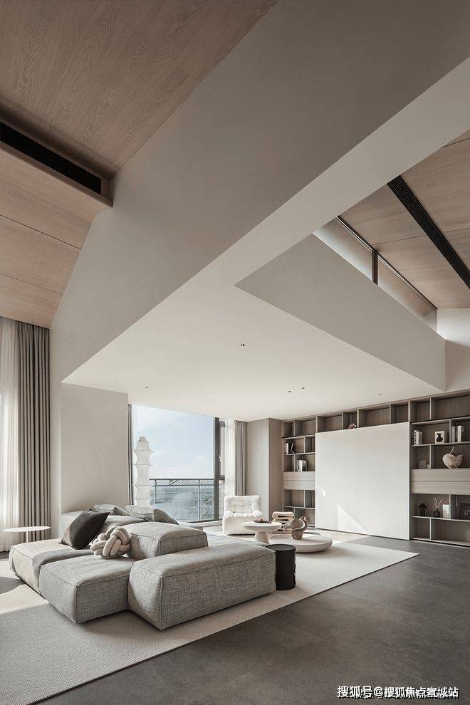 下方设计师特意开出一个低窗,与露台取得了巧妙的联动,呼吸感十足,让人在客厅之中,可以抬眼望向窗外景观,将生活的张与驰拿捏得恰到好处。